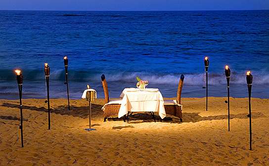 • романтический ужин со свечами на берегу под звездами, ужин с тремя сменами блюд с морепродуктами, обслуживание персональным дворецким